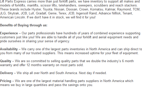 We have first-rate prices on all our lift truck parts. For a price quote on a part or attachment we offer, please call us at: